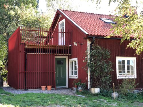 Byggnaden är täckt av ett rött raster, som både både fungerar som spaljé och som räcke för terrassen. Konstruktionen är enkel. Betongplatta på mark och väggar av lättklinkerblock. Terrassen är en separat träkonstruktion som vilar på blockmuren. Både trä och murar är målade i röd falufärg, lika huvudbyggnaden, och är ett diskret, modernt tillskott till den gamla sommarstugan.