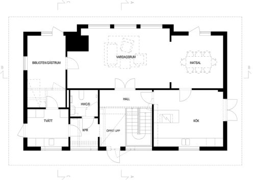 Mot infarten vänder huset en fasad som har fått helt nya fönsterplaceringar. Lågt sittande fönster ger dagsljus till källaren. I interiören har rummen fått nya material. Nya massivdörrar i ask matchas av breda foder och socklar i samma träslag. Hall, kök och tvättstuga har försetts med golv av Höganäsplattor. Köket har fått en ny inredning med bland annat bänk i carraramarmor runt spisen.