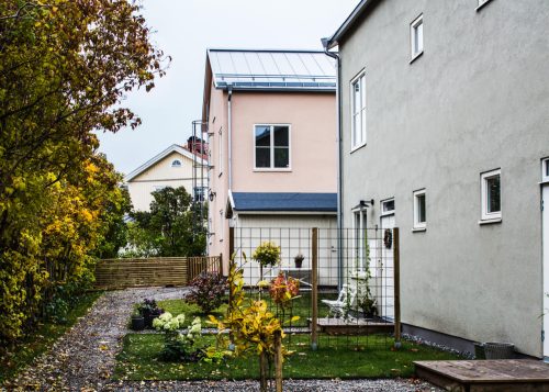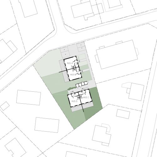 Husen är placerade på tomten så att alla bostäder ska få en privat uteplats med trädgård mot söder. Bostäderna har en gemensam parkeringsplats och entréer mot nordost. Trots att tomten nu rymmer fyra bostäder istället för en, men det finns gott om trädgårdsyta och några fina bevarade träd ger extra hemtrevnad.