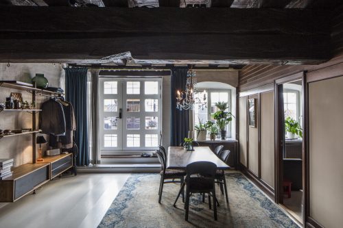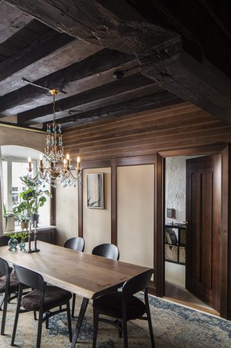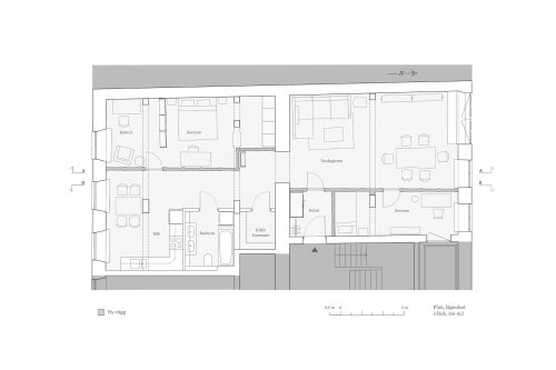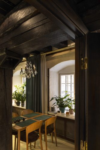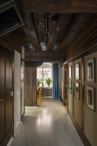 När vår uppdragsgivare köpte den här mycket speciell lägenheten i ett kulturskyddat hus i Gamla Stan bestod den av två stora rum, det ena ett kök, med grova takbjälkar och pelare i trä som det inte var tillåtet att ens fästa så mycket som en skruv i. Vi förvandlade den från ett rum och kök till fyra rum och kök med två sovrum, arbetsrum, vardagsrum och kök.