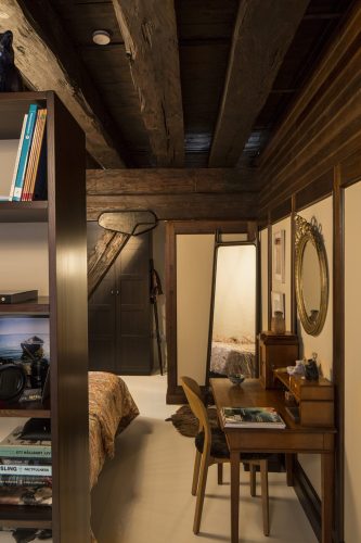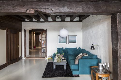 De nya väggarna är ramverk i massivträ med fyllningar av målade gipsskivor. Dessa är fästa i takets plankor med specialgjorda beslag. Dörrarna är skräddarsydda och även de gjorda i massivträ. Fönstren försågs med gardiner för att hindra insyn och radiatorerna kläddes in. Den befintliga köksinredningen anpassades, men övriga förvaringsmöbler är nya och specialritade. Den smakfulla inredningen står vår uppdragsgivare för.