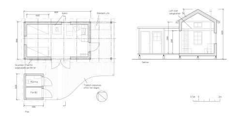 Vår beställare hade letat länge efter ett lämpligt hus att ha som fritidsboende i eller kring Söderboda på Gräsö utan framgång. Det var svårt att hitta ett hus som passade i pris, storlek och karaktär. Däremot hittade hon en skogstomt som passade och hon bad oss rita ett bygglov på ett litet hus för en person. Från början var det tänkt att en byggymnasieutbildning i Uppsala skulle bygga huset på skolan och sen transportera ut det till Gräsö på lastbil. Därför behövde huset hålla sig innanför vissa mått. Nu blev det inte så utan snickare lokalt på ön kunde hjälpa till att bygga huset, men de kompakta måtten blev de samma.